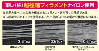 1. ナイロンタオルとしては最も細い、東レ(株)66ナイロン0.3Tex超極細フィラメントを採用することにより、きめ細かな泡ができます。