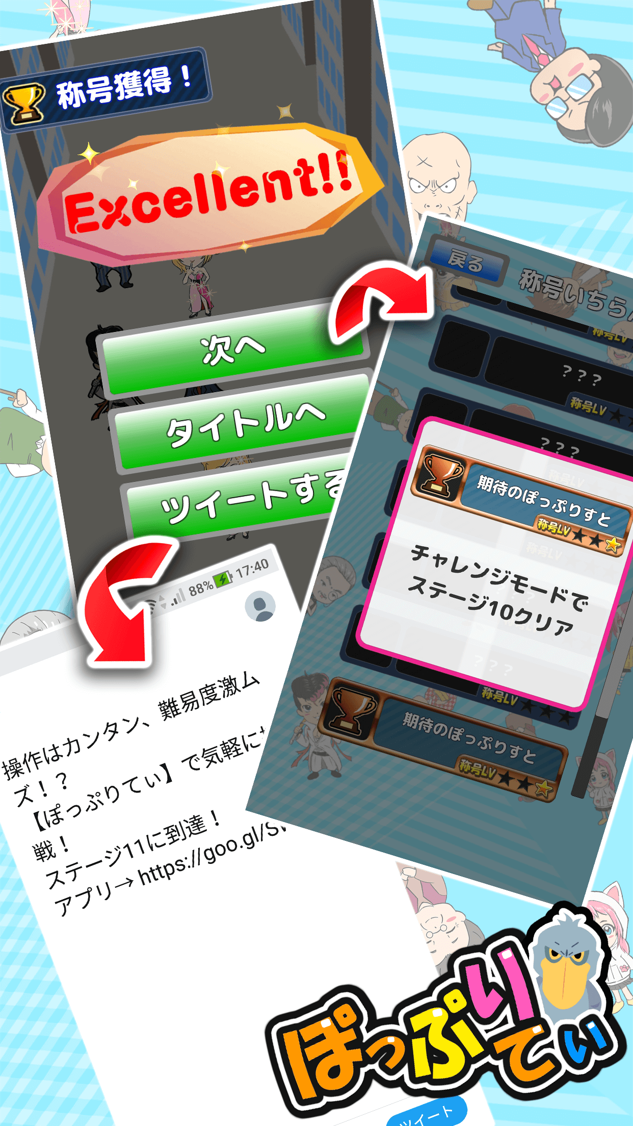「ツイート」機能は、「チャレンジもーど」で各ステージの結果画面で到達したステージの情報をツイートすることができます。