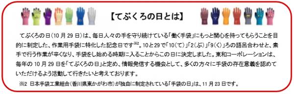 てぶくろの日(10月29日)は、毎日人々の手を守り続けている「働く手袋」にもっと関心を持ってもらうことを目的に制定した、作業用手袋に特化した記念日です※2。10と29で「10(て)」「2(ぶ)」「9(く)」ろの語呂合わせと、素手で行う作業が辛くなり、手袋をし始める時期に入ることからこの日に決定しました。東和コーポレーションは、毎年の10月29日を「てぶくろの日」と定め、情報発信する機会として、多くの方々に手袋の存在意義を認めていただけるよう活動して行きたいと考えております。