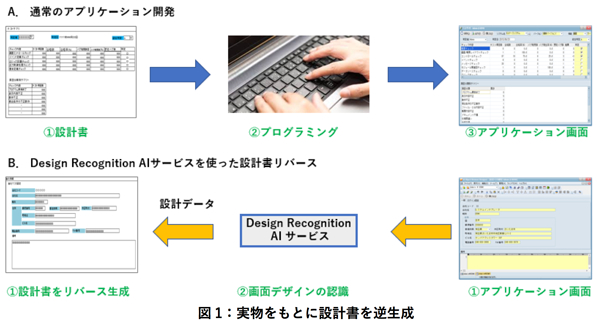 そこで、全世界に共通する「実物をもとに設計書を作成したい」というニーズを満たすため、AIを使って実際の画面から設計データを逆生成するDesign Recognition AIサービスを販売開始します(図1 B)。