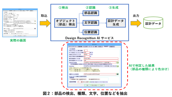 Design Recognition AIサービスは、(1)画面からオブジェクト(設計部品)を検出する、(2)部品の種類や文字、位置を認識する、(3)取得した情報をもとに設計データを生成する、という3つの連続した処理で実際の画面から設計データを逆生成します(図2)。