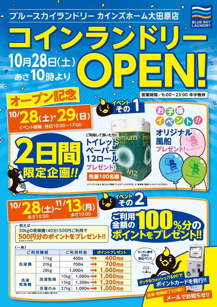 私たちブルースカイランドリーは、大手商業施設敷地内にコインランドリーを集中出店しております。この度2017年10月28日(土)より栃木県大田原市のカインズホーム大田原店駐車場敷地内に栃木県第2号店となるブルースカイランドリーカインズホーム大田原店をオープンします。ブルースカイランドリーの特徴は午前中の3時間パートが常駐しており店内の掃除やお客様への接客を行い利用者の皆様に綺麗で快適な店舗をご提供しております。
