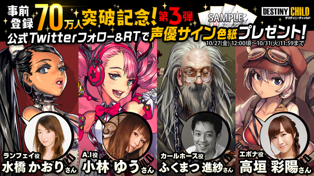 株式会社ステアーズ(本社:東京都渋谷区、代表取締役社長 全 寅兌、以下ステアーズ)は、事前登録受付中の『デスティニーチャイルド』の事前登録者数が2017年10月11日(水)に70万人を突破したことを記念し、本日2017年10月19日(木)より、ゲーム内に出演している豪華声優20名の直筆サイン色紙がもらえるプレゼントキャンペーンを開始したことをお知らせいたします。
