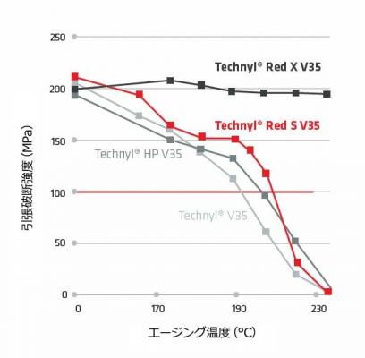 Technyl(r) Red Sの連続使用温度は、最高210度C(1,000時間)もしくは200度C(2,000時間)です。またTechnyl(r) Red Sの革新的な組成は、耐衝撃性、酸縮合物に対する耐薬品性、高流動性、優れた外観品質、卓越した溶着性など、いくつもの利点が強化されています。