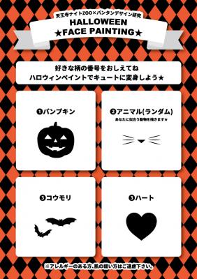 ハロウィン定番のデザインから、学生が考えたデザインなど「ハロウィンナイトZOO」を盛り上げるフェイスペイントを実施します。一人当たり5分から10分程度のペイントを予定しています。