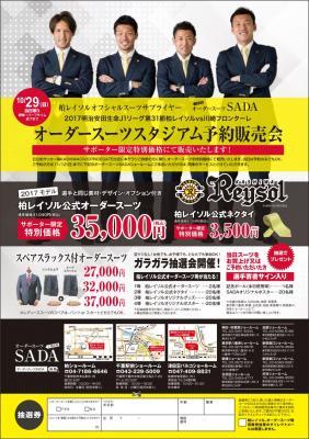 工場直販オーダースーツSADAは10/29(日)に日立柏サッカー場にて「オーダースーツ販売会」を開催致します。スタジアム販売会に際しまして、2017年モデルの柏レイソル公式オーダースーツを発売致します。オーダースーツSADAは、スーツサプライヤーとして2017年シーズンも柏レイソルを応援致します。