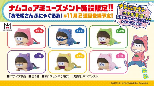 株式会社ナムコ(本社:東京都港区/社長:萩原 仁)は、“リア充撲滅!6つ子のニートたちがナムコを乗っ取った”をコンセプトに、大人気TVアニメ「おそ松さん」との様々なコラボレーションキャンペーンを、テーマパーク「ナンジャタウン」(東京・池袋)、全国のアミューズメント施設、次世代キャラクターカフェ「アニON STATION」(全国5店舗)、謎とき体験ポータルスタジオ「なぞともCafe」(全国7店舗)他で11月10日(金)から順次開催します。