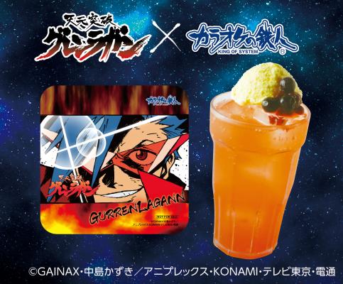 作品内の名言パロディをドリンク名に冠した5種のオリジナルコラボレーションドリンク(以下「コラボドリンク」)を、各550円(税込み)にて店頭で販売いたします。ドリンクは、「飲めよダチ公(カミナ)」、「ドリンク飲むなら全部飲む!おかわりしても飲み続け飲み干したなら俺の勝ち!(シモン)」、「お茶とジュースは違う飲み物です。ずっとずっっと違う飲み物です。でも違う飲み物同士だから美味しいと思うんです。(ニア)」、「いざっていうときどうするの!?飲むのも仕事のうちよ(ヨーコ)」、「俺たちを誰だと思っていやがる!!(大グレン団)」のラインナップです。