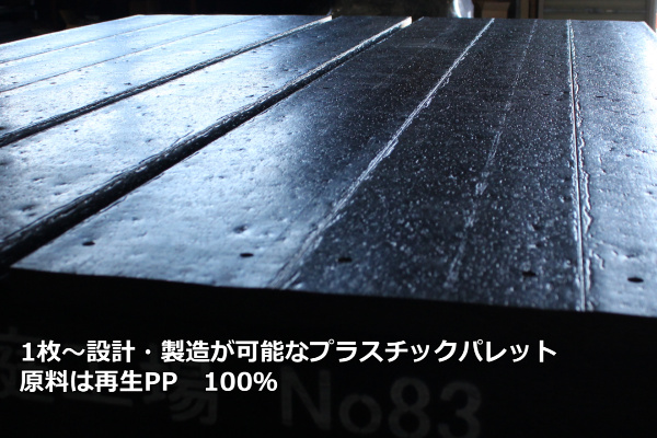 原料は再生PP(ポリプロピレン)100%の黒の角材や平板材を使ってお客様のご希望のサイズや仕様に合わせて1枚から設計、製造、販売をさえていただきます。価格は大きさ、サイズ、仕様にもよりますが、平均1枚単価10、000円~20,000円/枚が主流です。また従来のプラスチック一体型パレットのように金型代(イニシャルコスト)が不要になり小ロット、1枚からの販売も可能です。木製のパレットの木屑やカビなどを懸念される、デリケートな商品を取り扱っておられる企業様や、木製パレットの廃棄、また燻蒸処理をコストをかけておられるお客様などにご好評いただいております。