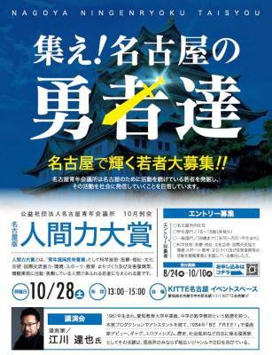 そこで、私共、名古屋青年会議所は、様々な分野において、志を持って社会のために活動を続けている若者を発掘し、彼らを社会に対して強く発信していくことが必要と考え、若者たちの情熱と市民全体の社会をより良くしたいという気持ちが共鳴試合、そのエネルギーが、この名古屋の未来を明るく豊かなものへと変えていくことを目的として、本例会を開催させていただきます。