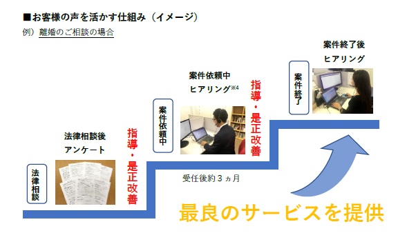 法律相談時、案件依頼中、案件終了後において、弁護士の接遇やマナー、弁護活動への疑問や不満、その他ご意見・ご要望を伺います。(原則、すべてのお客様にご協力をお願いします)