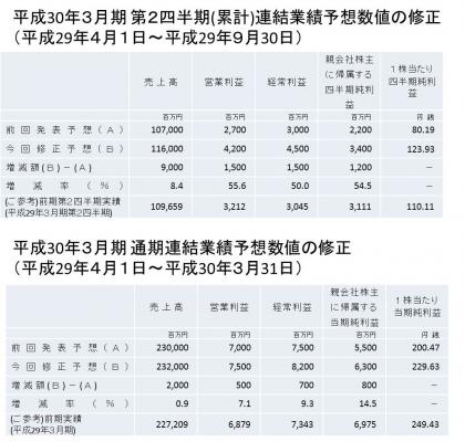 最近の業績動向を踏まえ、平成29年8月8日に公表した業績予想を下記の通り修正いたしましたのでお知らせいたします。