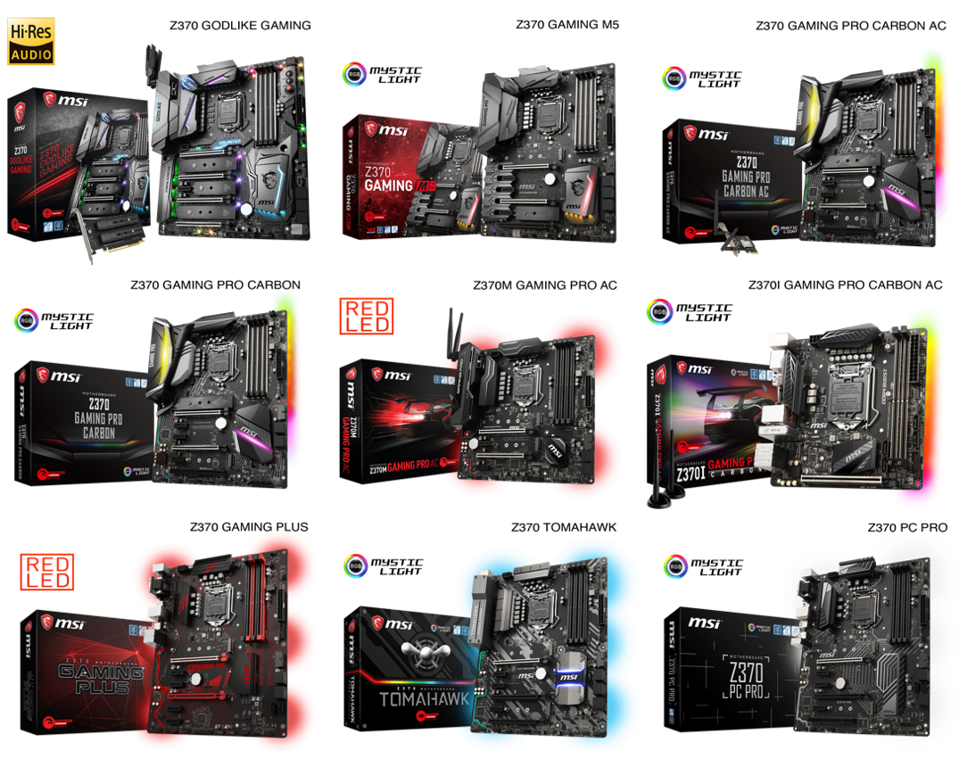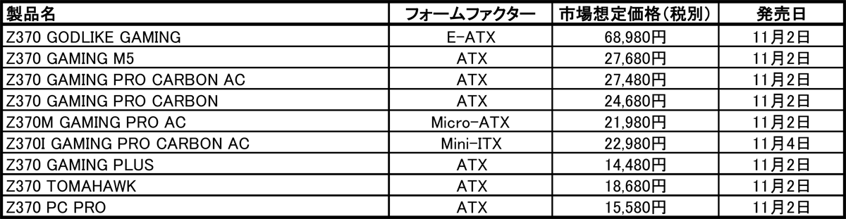 2017年10月26日-Micro-Star International Co., Ltd. 台湾・新北市- マザーボードの設計で世界をリードするMicro-Star International(MSI)は、11月2日より販売が開始されるIntelの第8世代プロセッサの登場に先立ち、Intel Z370チップセットを採用したマザーボード9製品の先行予約販売を10月27日より開始いたします。その製品構成と市場想定価格、発売日は以下のとおりです。