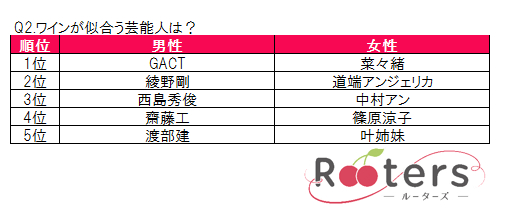 「ワインが似合う芸能人は?」という質問にはGACTが1位に。ワインや肉・盆栽などの価格などを当てる人気番組で毎回1位になるほどの目利きとセレブ感からランクイン。また食通として知られる渡部建もランクイン。「美味しくて素敵なお店に連れて行ってくれそう」との声も。