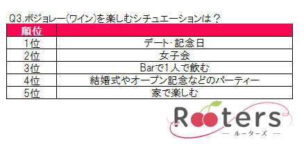 月間800本、年間25万人を動員する恋活パーティー動員数業界1位の株式会社Rooters(本社:東京都港区、代表取締役社長:土居宏次)は、2017年10月15日~20日の期間において、20歳~39歳の男女300名に「ボジョレーヌーヴォと男女の出会い」に関してのアンケートを実施しました。