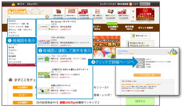 多くのポイントサイトでは、取り扱う広告案件数が多く、日々追加や更新が行われることから、上位表示される広告案件以外は埋もれてしまうことや、ユーザが意欲的にメリットの高い広告案件を探す傾向がある一方で、既存の検索機能の使いづらさが、目的達成を妨げる課題としてあります。