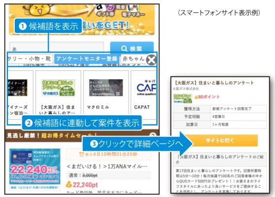 今回、導入を進める「ポップリンク」は、検索キーワード入力時に、検索窓上に候補語と、候補語に連動する広告案件の画像リンクを複数表示します。上位表示される広告案件以外は埋もれてしまいがちなポイントサイトでも、多くの広告案件の露出が可能です。