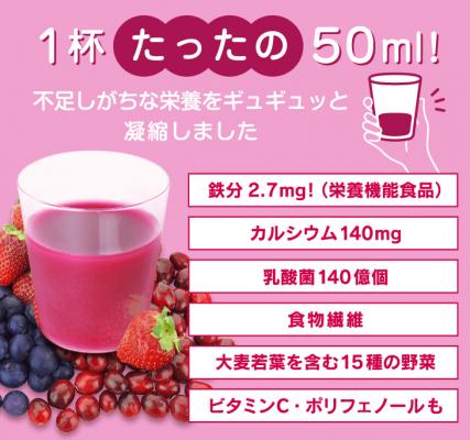 「こどもフルーツ青汁 赤の恵み」(まろやかベリーミックス味)は、従来のこどもフルーツ青汁に含まれる「野菜・カルシウム・乳酸菌・美味しさ」はそのままに、鉄分やビタミンC、ポリフェノールが豊富な赤の野菜とフルーツをプラスしています。