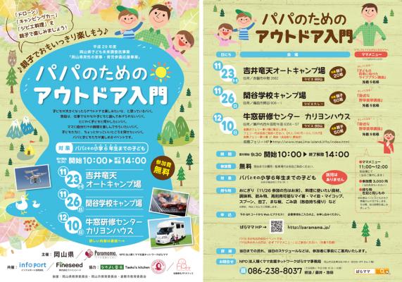 株式会社ファインシード(本社:東京都渋谷区、代表取締役社長:頼定 誠)とNPO法人輝くママ支援ネットワークぱらママ(所在地:岡山県北区、代表理事:藤井 弥生)は平成29年岡山県子ども未来課委託事業「岡山県男性の家事・育児参画応援事業」として「パパのためのアウトドア入門」イベントを11月23日(木・祝)、11月26日(日)、12月10日(日)に開催する事をお知らせいたします。参加費は無料です。是非ご参加ください。