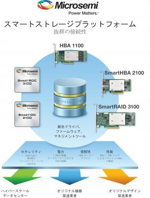 2017年11月2日 - カリフォルニア州アリソビエホ - Microsemi Corporation (Nasdaq:MSCC)は本日、新たにSmart Storage SAS/SATA アダプタの製品リリースを発表しました。Microsemiは、業界をリードする低消費電力、セキュリティ、信頼性、パフォーマンスで高度に差別化された半導体ソリューションを提供してきました。進化したこれらSmart Storageアダプタのリリースにより、高度に統合されたボード製品からシリコン(半導体)とソフトウェアの提供によるカスタムソリューションまでを網羅したMicrosemiのデータセンター用SAS/SATAサーバーストレージ向けSmart Storageソリューションの提供を推し進めます。Microsemi Adaptec HBA 1100 シリーズ、SmartHBA 2100 シリーズおよびSmartRAID 3100 シリーズからなるSmart Storage製品ポートフォリオは、同社先端の 28nmプロセスによる SmartIOC 2100およびSmartROC 3100ストレージコントローラーICをベースとし、ソフトウェア・デファインド・ストレージ(SDS)、コールドストレージ、エンタープライズアプリケーションを含む多様なサーバーストレージのアプリケーションに対応する高性能、低消費電力、高信頼性、高機能なソリューションを提供します。