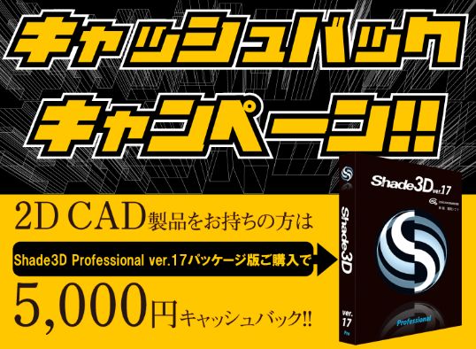 2DCADソフトをお持ちの方で「Shade3D Professional ver.17パッケージ版」を購入いただいた方にはもれなく5,000円をキャッシュバック!