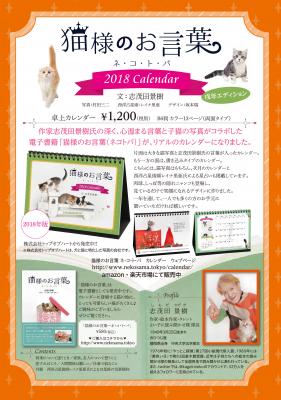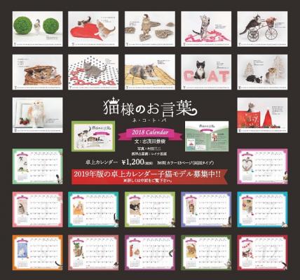 犬猫に特化した写真撮影及びストックフォトサービスを提供する株式会社トップオブハート(所在地:東京都新宿区)は、2017年11月2日より、作家・ 志茂田景樹氏とのコラボによる2018年版『猫様のお言葉 ネ・コ・ト・バ』卓上カレンダーの販売を開始しました。一年を通していつも側にあるものだからこそ、大人可愛いデザインで、お部屋のインテリアとしてもお洒落にご利用いただけます。上手くいく日も、いかない日も、子猫たちに癒され、 励まされ、隠れニャンコや星占いで、使って楽しい宝箱のようなカレンダーです。 2018年版はかわいい子犬もゲスト登場する戌年エディションです。