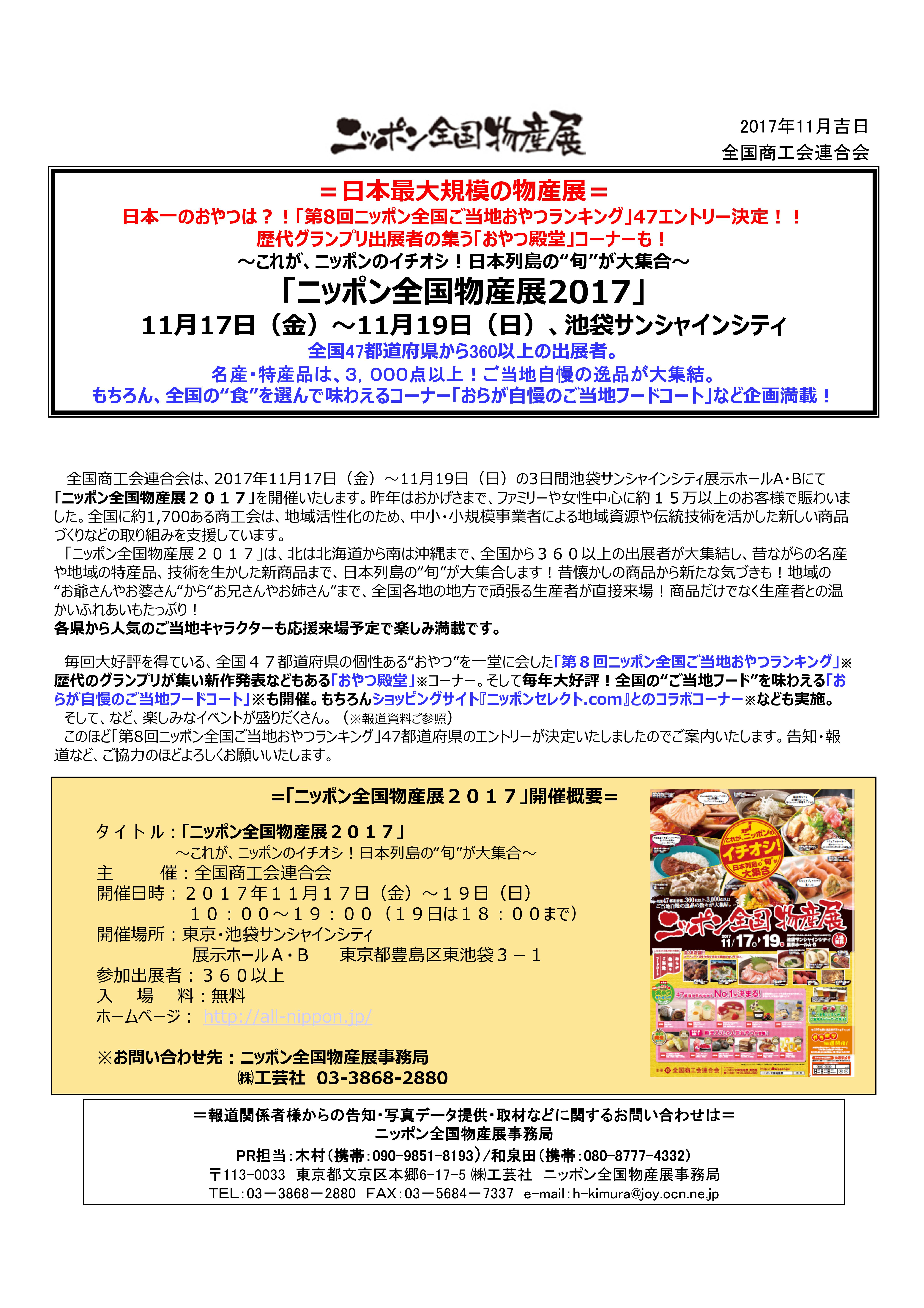 全国商工会連合会は、2017年11月17日(金)~11月19日(日)の3日間池袋サンシャインシティ展示ホールA・Bにて「ニッポン全国物産展2017」を開催いたします。昨年はおかげさまで、ファミリーや女性中心に約15万以上のお客様で賑わいました。全国に約1,700ある商工会は、地域活性化のため、中小・小規模事業者による地域資源や伝統技術を活かした新しい商品づくりなどの取り組みを支援しています。「ニッポン全国物産展2017」は、北は北海道から南は沖縄まで、全国から360以上の出展者が大集結し、昔ながらの名産や地域の特産品、技術を生かした新商品まで、日本列島の“旬”が大集合します!昔懐かしの商品から新たな気づきも!地域の “お爺さんやお婆さん“から“お兄さんやお姉さん”まで、全国各地の地方で頑張る生産者が直接来場!商品だけでなく生産者との温かいふれあいもたっぷり!各県から人気のご当地キャラクターも応援来場予定で楽しみ満載です。