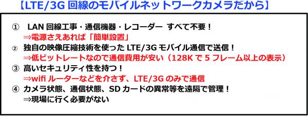 SD級ライブ映像を独自の圧縮技術を使ってクラウドへ送るためLTE/3Gの低額な無制限通信プランを使って動画の運用ができる。