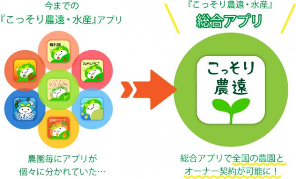 『こっそり農遠』アプリとは、スマートフォン上で、自分だけの本物の農園・水産とオーナー契約ができる、地方創生に繋がる農業IoTアプリです。農遠・水産オーナーになると、24時間いつでもどこでもスマートフォン上で作物の育成状況を見ることができます。育った作物はプロの農園・水産スタッフが実際に収穫し、新鮮な状態で一つ一つ丁寧に包装し、ご自宅にお届けします。また、親しい方へギフト配送することもできます。従来の『こっそり農遠・水産』では、提携農園・水産毎にアプリが分かれておりましたが、今回のアプリで1つに統合したことにより、複数の農園・水産とオーナー契約が可能になり、もっと便利に使いやすくなりました。