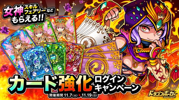 期間中、ログインすると、「竜石」がもらえる「カード強化ログインキャンペーン」を開催いたします。また、5日ログインごとに「天輝ジェムマローン」や「女神スキルフェアリー」など豪華アイテムをプレゼント!『ドラゴンポーカー』に毎日ログインして、プレゼントを受け取りましょう!