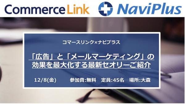 ECサイトの集客・売上拡大を支援するコマースリンク株式会社(本社:東京都大田区、代表取締役社長:藤田 由希子)は、ナビプラス株式会社(本社:東京都渋谷区、代表取締役執行役員CEO:篠 寛)と共催で『「広告」と「メールマーケティング」の効果を最大化する最新セオリーご紹介』と題した無料セミナーを2017年12月8日(金)に開催します。