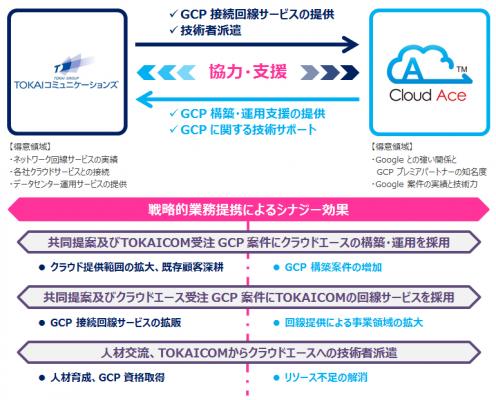TOKAIコミュニケーションズは、GCP への接続サービスをはじめとするネットワークやデータセンターなど、通信事業者ならではのインフラ基盤及びシステム系・基盤系を中心とする技術力・開発リソースを強みとしており、今回、GCP のプレミアパートナーとして GCP 導入・技術サポート分野で国内トップクラスの実力・実績を有するクラウドエース様と相互補完しあえる関係となることで、強力なシナジーを創出し、顧客満足の向上と両社のさらなる発展を実現できるものと確信しております。