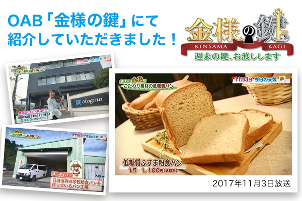 株式会社 OTOGINO(オトギノ:代表取締役社長 鬼武公洋 本社 大分県日田市北友田 2 丁目 2123 番地 1)がE-コマースにて販売している【低糖質ふすま粉パン】(http://www.ohmypan.jp)が、OAB大分朝日放送のテレビ番組『金様の鍵』(2017年11月3日9:55~放送)の「いま注目!ローカーボ」のコーナーで紹介されました。ローカーボを積極的に取り組んでいる大分県の企業として、弊社の【低糖質ふすま粉パン】が今回取り上げられました。(放送内容:https://www.oab.co.jp/kinsama/backnumber/171103.html)