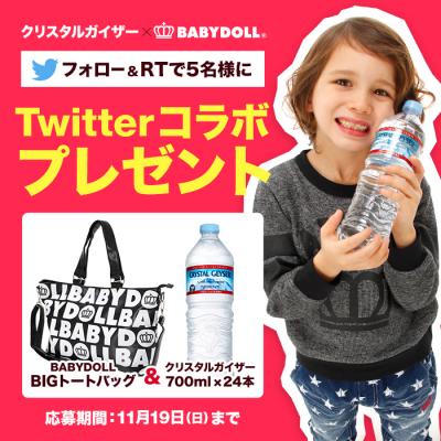 株式会社コージィコーポレーションが運営するベビー・キッズ服ブランドBABYDOLL(ベビードール)が、BABYDOLL公式Twitter(@starvations)とクリスタルガイザー公式Twitter(@CG_jp)をフォロー&RTで<BABYDOLLビッグトートバッグとクリスタルガイザー700ml×24本>が抽選で5名様に当たる!『BABYDOLL×クリスタルガイザー★Twitterプレゼントキャンペーン』を開催!