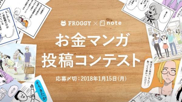 募集期間は2018年1月15日(月)までで、投資や貯金、浪費癖や遺産相続などお金にまつわるマンガを募集。4コマ、エッセイ、ギャグ、ヒューマンなど、作品の形態は問いません。「共感」「オリジナリティ」を基準に審査させていただき、入選された作品には、賞金を最大30万円ほか、FROGGYでのマンガ連載権などをお贈りいたします。