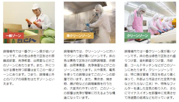 例えば、弊社工場はクリーン度によって3つのゾーンに分けられ、各ゾーンに合わせた独自の衛生管理が行われています。そして、人や物の動きを全て一方通行とすることで食中毒の主要原因である「交差汚染」を防ぐ仕組みが整えられています。また、菌がもっとも増殖する危険温度「20~60度」を素早く通り過ぎるように、製造したおかずなどを特別な「冷却器」を使い急速に温度を下げています。