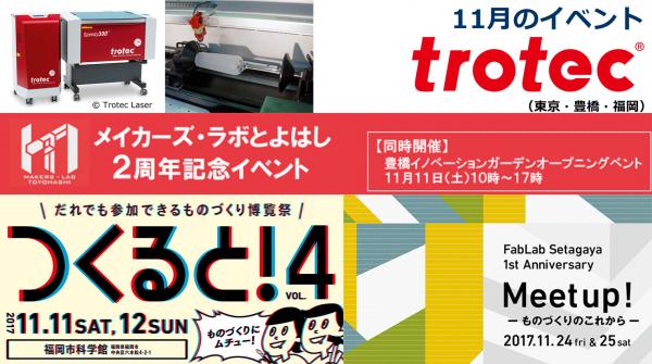 レーザー加工機メーカーのトロテック(本社:欧州オーストリア)は、11月に東京都・愛知県・福岡県で開催される下記3つのイベントで、当社のレーザー加工機を使用した講座やデモを実施します。入場料/受講料はどれも無料です。この機会にぜひトロテックのレーザー・テクノロジーを体験してください。