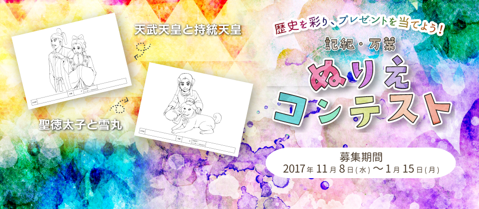 この度、さらにより多くの方々に興味を持って頂けるよう、コンテスト形式の施策として、“記紀・万葉”ゆかりのモチーフを自由に彩色し応募いただく、『記紀・万葉 れきし ぬりえコンテスト』を、2017年11月8日(水)~2018年1月15日(月)(※必着)の期間に開催いたします!