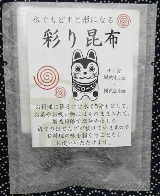 北海道産長昆布を使用し、遊び心たっぷりの『彩り昆布』。乾いた状態で小袋に入れており、水で5分ほどもどすと文字や形、絵柄となります。ユニークなキャラクターや季節限定、地方限定の商品も用意しています。