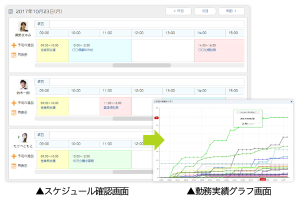 また、残業管理機能は、勤務実績から残業時間だけを切り出し、「法定内」「法定外」「深夜」と色分けしたグラフとして確認できる機能です。残業が超過した社員のグラフは赤く表示され、社員の一覧表示から一目で把握できます。スケジュール機能と残業管理機能を連動させることで、社員の時間の使い方を見える化し、管理職がマネジメントにかける時間を短縮しつつ部下の行動を適確にサポートできるようにします。