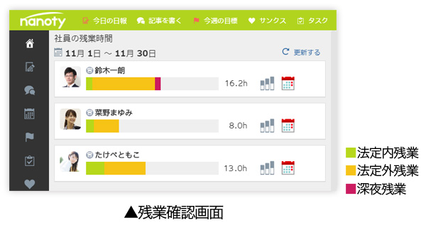 Webサイト制作やシステム開発で中小企業のIT活用をサポートしている株式会社サンロフト(静岡県焼津市、代表取締役社長:松田敏孝)は、2017年11月9日、社内SNS型クラウド日報サービス「nanoty(ナノティ)」で、ユーザー企業の管理職層から要望の多かった「スケジュール」と「残業管理」の機能を追加しました。これにより、管理職が部下の勤務状況を数値で把握し、就労実態に基づいた人材育成やマネジメントを行えるようになります。