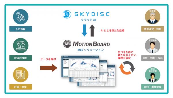ウイングアーク1st株式会社(本社:東京都渋谷区、代表取締役社長CEO:内野弘幸)と株式会社スカイディスク(本社:福岡市中央区、代表取締役 CEO:橋本司)は、ウイングアークが提供する情報活用ダッシュボード「MotionBoard」を中心にした製造業向けMES(Manufacturing Execution System:製造実行システム)ソリューションと、IoT分野に適した解析ノウハウで、人では気づかない故障予知や正常異常判定ができるクラウドAIプラットフォーム「SkyAI(スカイエーアイ)」の連携、および製造業でのAIの利用促進において協業することを本日発表します。