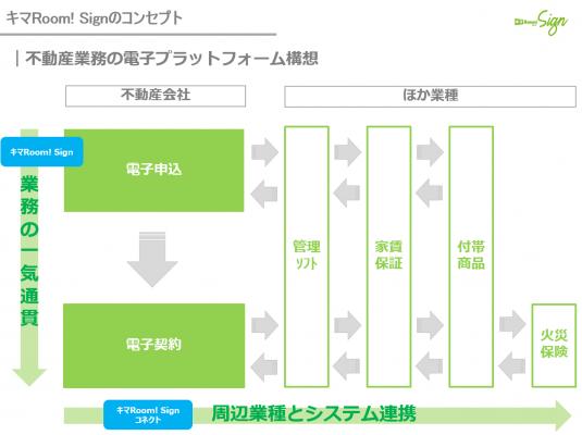このようなサービス思想のもと、キマRoom! Signは「不動産業務の電子プラットフォーム構想」を掲げ、以下のサービスをリリースすることで「不動産業務の電子プラットフォーム」を実現し、不動産会社、その周辺会社の抜本的な生産性向上を図ることを表明致します。