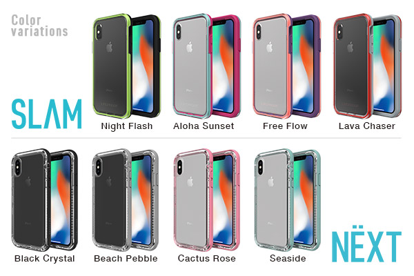 カラーは、発売中のiPhone 8/8Plusと同様、耐衝撃ケース『SLAM for iPhone X』からは「NIGHT FLASH」「ALOHA SUNSET」「LAVA CHASER」「FREE FLOW」の4色、防塵・防雪・耐衝撃ケース『NEXT for iPhone X』からは「BLACK CRYSTAL」「BEACH PEBBLE」「SEASIDE」「CACTUS ROSE」の4色のラインナップで展開致します。