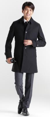種類は、素材の異なるステンカラーコートで2型を展開します。1型は、ストレッチ性、撥水性に加えボンディング加工(2つの素材を貼り合わせたもの)によりハリと保温性を高め、合繊繊維でありながらウールのような風合いのコートです。もう1型は、生地に膨らみと柔らかい風合いを出し凹凸のある織り組織を採用したウール混コートです。
