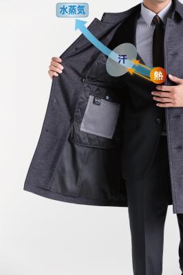 そこで弊社では、コートの中綿に透湿速乾技術「37.5テクノロジー」を採用することで、衣服内の湿度と温度を快適な状態に保ちムレやベトつきを軽減するビジネスコートを企画しました。今回発売するコートは、体から発せられる熱と湿気を中綿が吸収し、通勤電車内などで暑い時は吸収した熱を利用して湿気を素早く蒸発させ速乾性を高めています。また、外出して寒い時には吸収した熱を留め暖かくします。