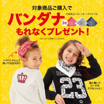株式会社コージィコーポレーションが運営するベビー・キッズ服ブランドBABYDOLL(ベビードール)がBABYDOLL(ベビードール)・STARVATIONS(スターベイションズ)各店にて、「新作バンダナシリーズご購入で★オリジナルバンダナ★プレゼント!」対象商品をお買い上げでもれなくオリジナルバンダナが貰えちゃうプレゼントキャンペーンを開催中!!