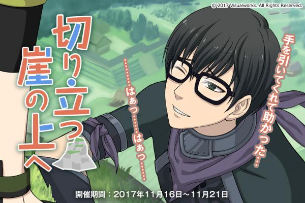 株式会社ビジュアルワークス(本社:東京都豊島区、代表取締役:落水恒一郎)は、スマートフォン版(Ameba、mixiゲーム、GREE)で好評配信中のカード式シナリオゲーム『結ひの忍』(ゆいのしのび)にて、2017年11月16日(木)より新キャラクター「たらこ(CV:逢坂良太)」の追加を行い、新イベント「切り立つ崖の上へ」を開催いたしました。