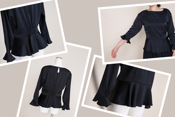 首元はスッキリ!裾と袖はペプラムのデザインで上品、な黒ブラウスがドレスルームアミオリジナルで販売開始となりました。演奏家の方が使いやすいデザインを追求して、当店オリジナルでデザインを考え、製作しました。店舗とオンラインショップ、どちらからでもお買い求めいただけます。税込み7560円のお手頃価格です。