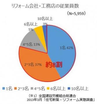 リフォーム会社・工務店の「人手不足」は社会問題となっています。とくに中小リフォーム会社・工務店の従業員数は少なく、1名が42%、3名以下で約80%を占めています。(※1)